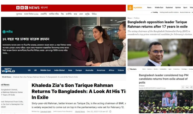 ভারতীয় গণমাধ্যমে এনডিটিভির সংবার শিরোনাম ছিল- খালেদা জিয়ার পুত্র তারেক রহমান বাংলাদেশে ফিরলেন: নির্বাসনের সময়টি যেমন ছিল।